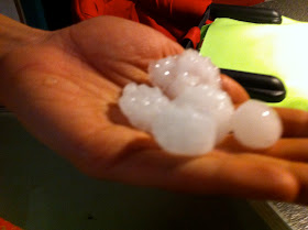We watched the storm roll towards us and got some hail, but no tornadoes. The temperature dropped 20 degrees in five minutes.