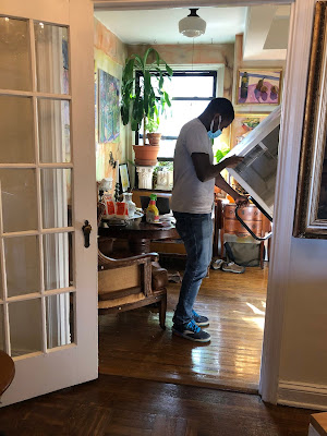 Listening to my refrigerator continually grinding away, and watching my electric bill go up by a third week to week, I have been trying to get a new one for a while. While I bought the old one —very old, I think more than 35 years old—myself, the building is obliged to supply me with one, and given that the "supply chain" is not what it should be, I thought it best to accept a slightly used refrigerator from another apartment. It's the right size, which it to say all Mammadou and Danny had to do was remove the stove knobs and handles and the refrigerator doors to get through the galley kitchen. I did not tell them that the building-supplied refrigerator from the 60s is still in the living room. And still functioning.